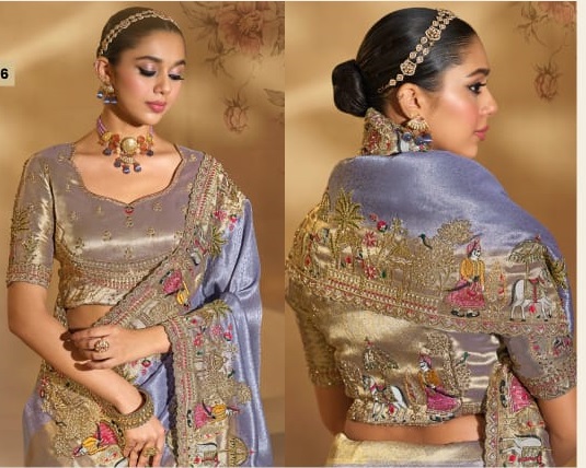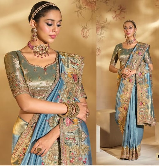 - Crafted from luxurious fabrics with intricate Zari weaves and vibrant hues, this collection blends timeless tradition with modern elegance. Each saree radiates regal charm, ideal for weddings, festive occasions, and grand celebrations. A true statement of grace