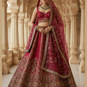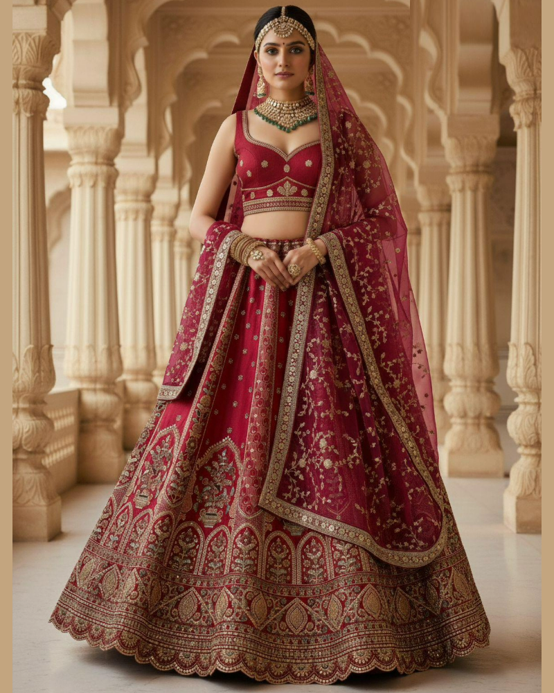 A bridal lehenga is a luxurious ensemble worn by brides, featuring a richly embroidered skirt, matching choli, and ornate dupatta. Crafted in vibrant hues and opulent fabrics, it symbolizes elegance, tradition, and the grandeur of Indian wedding celebrations.