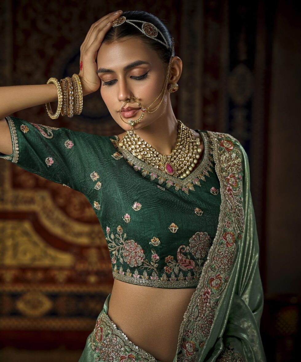 Drape yourself in timeless elegance with this silk wedding saree. Crafted from luxurious silk, it features intricate Zari work and shimmering embellishments that exude regal charm. Its rich color palette and graceful drape make it a stunning choice for brides who seek tradition with sophistication. Perfect for your most special day.