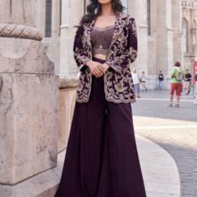 Party Wear Heavy Chinon 3 Piece Plazzo & Crop top Co ord Set