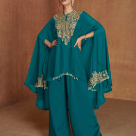 This kaftan-style palazzo suit is crafted in luxurious real silk for the top, choli, and palazzo. Featuring fine front and back embroidery with elegant tassels, it’s free size stitched perfect for graceful festive elegance.